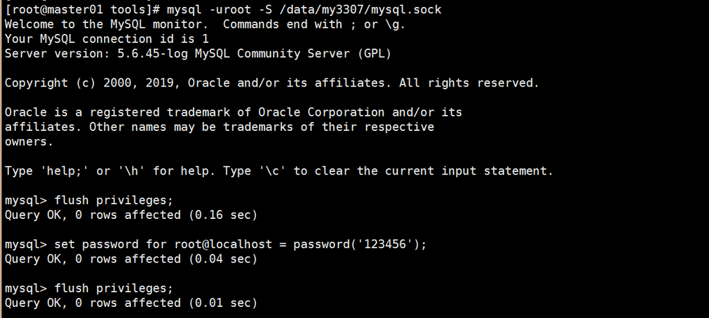 mysql> flush privileges; # 跳过登陆认证的,要想刷新授权表。Query OK, 0 rows affected (0.00 sec)