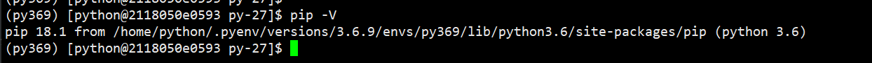 (py369) [python@2118050e0593 py-27]$ mkdir ~/.pip (py369) [python@2118050e0593 py-27]$ vi ~/.pip/pip.conf (py369) [python@2118050e0593 py-27]$ cat ~/.pip/pip.conf [global] index-url = https://mirrors.aliyun.com/pypi/simple/ [install] trusted-host=mirrors.aliyun.com (py369) [python@2118050e0593 py-27]$