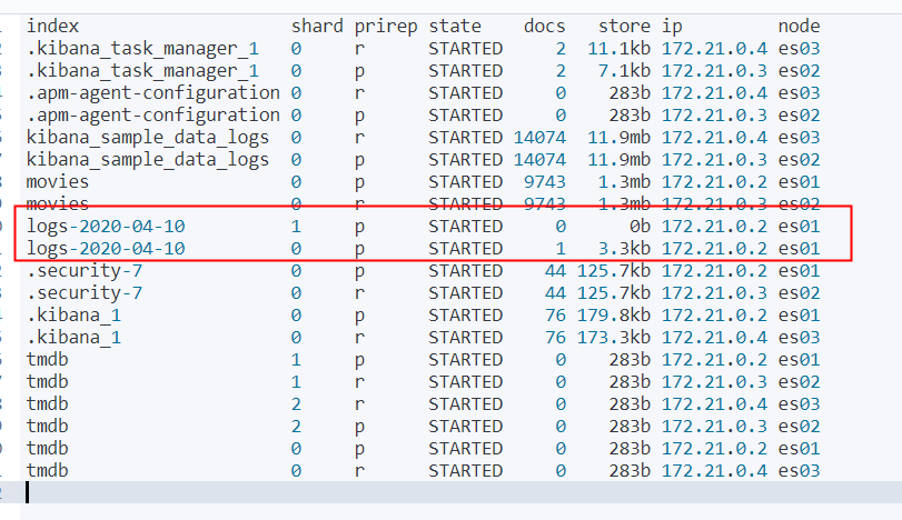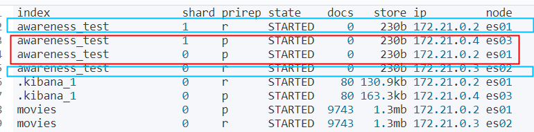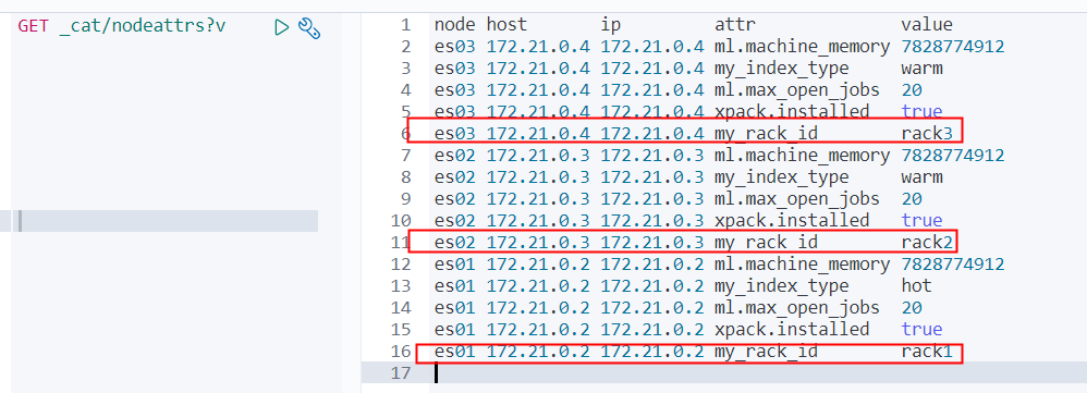 # Rack Awareness 配置过程 1. 标记Rack id echo 'node.attr.my_rack_id: "rack1"' >>/data/ELKStack/es01/conf/elasticsearch.yml echo 'node.attr.my_rack_id: "rack2"' >>/data/ELKStack/es02/conf/elasticsearch.yml echo 'node.attr.my_rack_id: "rack3"' >>/data/ELKStack/es03/conf/elasticsearch.yml 2. 重启各节点 -- $ elk -q es -s restart /usr/lib/python2.7/site-packages/requests/__init__.py:91: RequestsDependencyWarning: urllib3 (1.25.3) or chardet (2.2.1) doesn't match a supported version! RequestsDependencyWarning) Restarting es01 ... done /usr/lib/python2.7/site-packages/requests/__init__.py:91: RequestsDependencyWarning: urllib3 (1.25.3) or chardet (2.2.1) doesn't match a supported version! RequestsDependencyWarning) Restarting es02 ... done /usr/lib/python2.7/site-packages/requests/__init__.py:91: RequestsDependencyWarning: urllib3 (1.25.3) or chardet (2.2.1) doesn't match a supported version! RequestsDependencyWarning) Restarting es03 ... done 3. 检查es 的标记