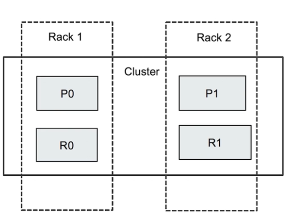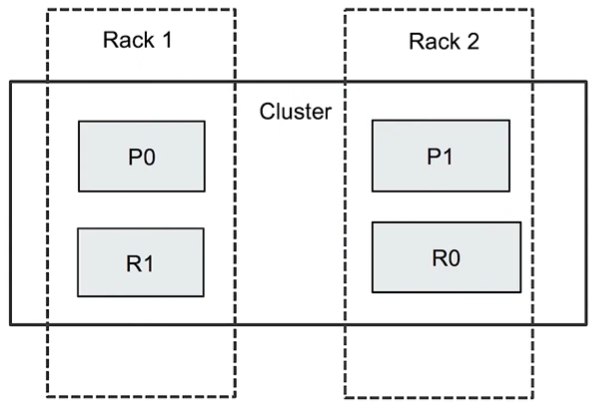 如下图:索引分片时,如果不做干预,可能会导致索引 0 的主分片 P0 和副本分片R0 同时分布在Rack1 上,如果Rack 1 断电,则会导致整个 索引 0 不可用。