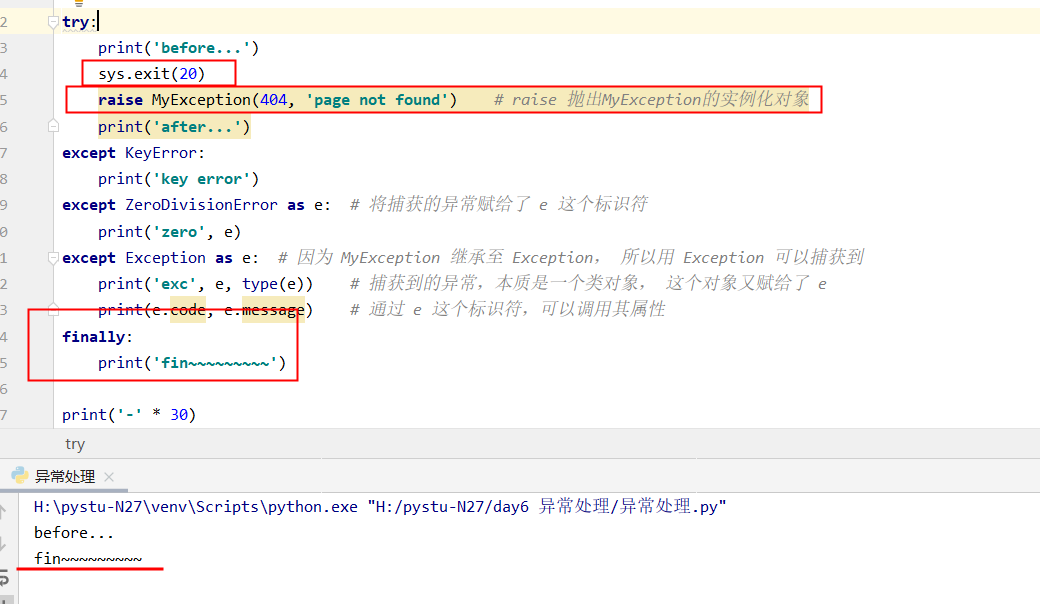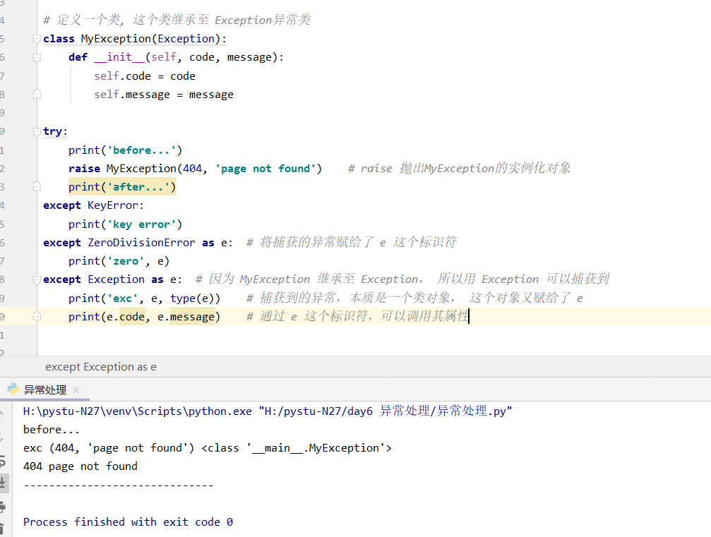 raise可以收到抛出异常,但是抛出的异常必须由对应的异常类型才能接收, 在这里自定义异常 MyException是继承的Exception类, 所以Exception可以接收。