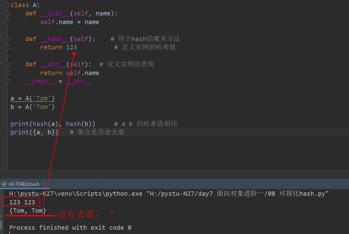 虽然两个实例的哈希值相同,但是集合去重比较的除了哈希值外,还有元素内容。