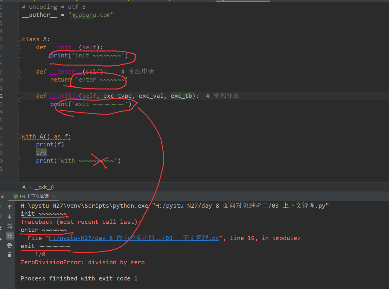 __enter__ 负责资源的申请工作,__exit__负责资源的释放工作。有异常影响,__exit__的释放操作不受影响,如下: