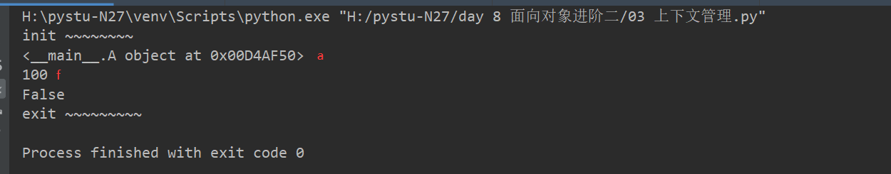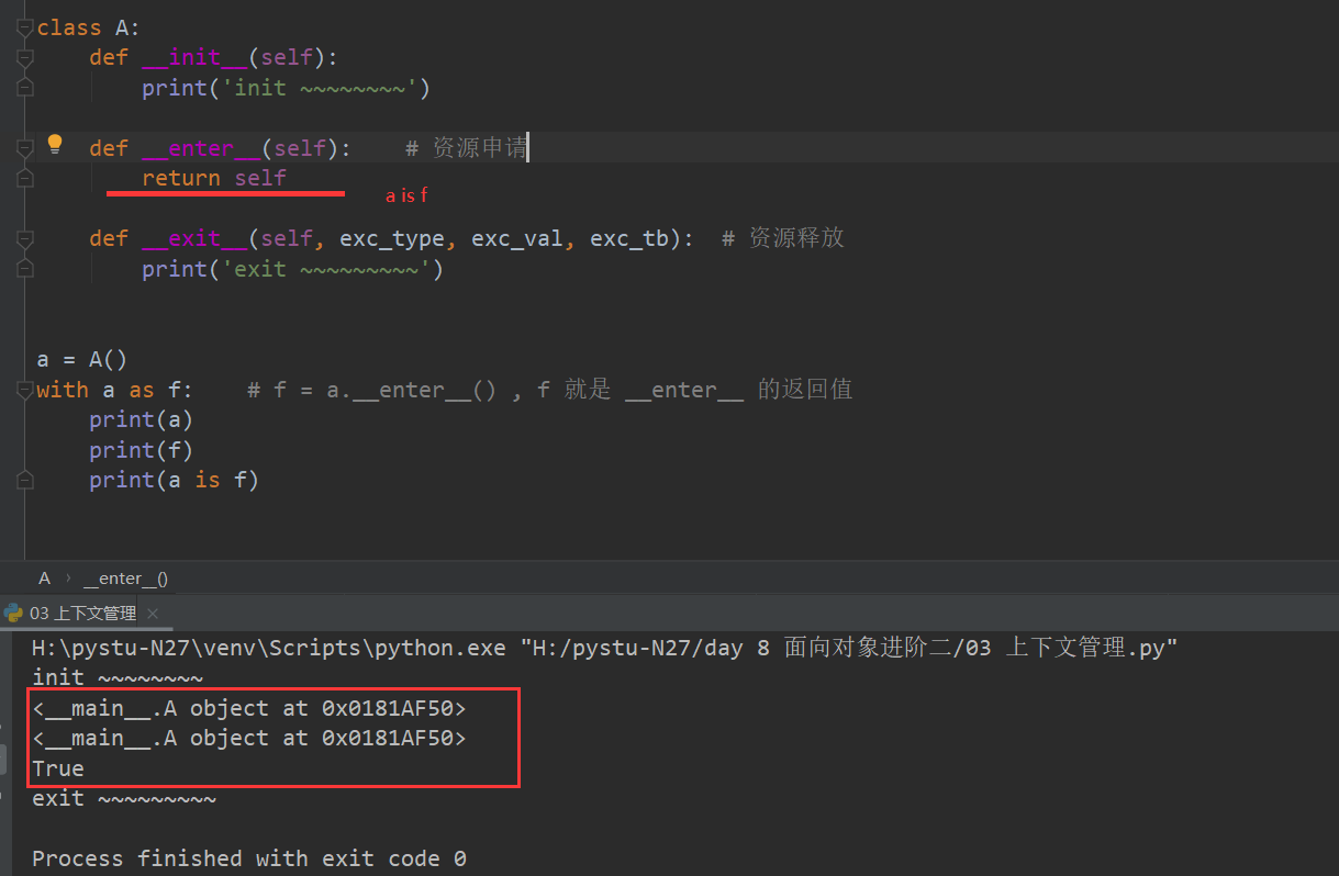 as 子句的对象 f, 其实就是前面实例的 __enter__方法的返回值,如果返回self,则 a is f