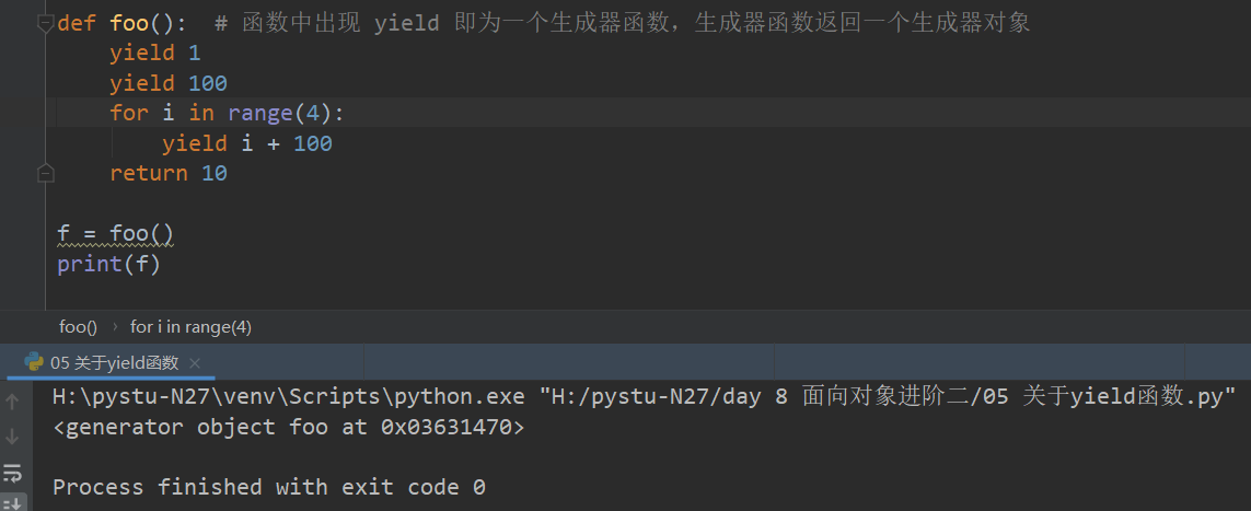 def foo(): # 函数中出现 yield 即为一个生成器函数,生成器函数返回一个生成器对象