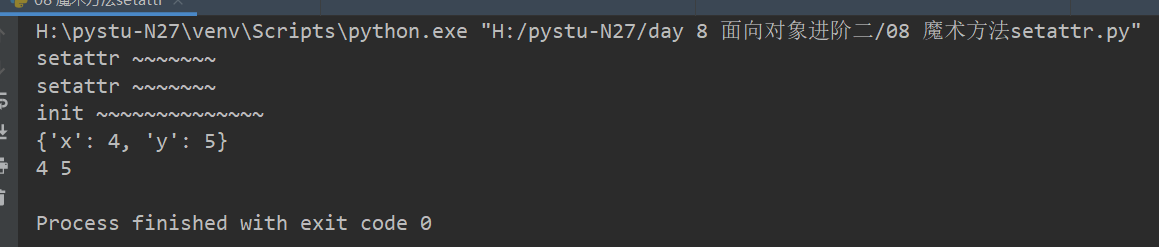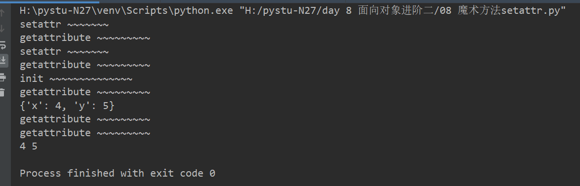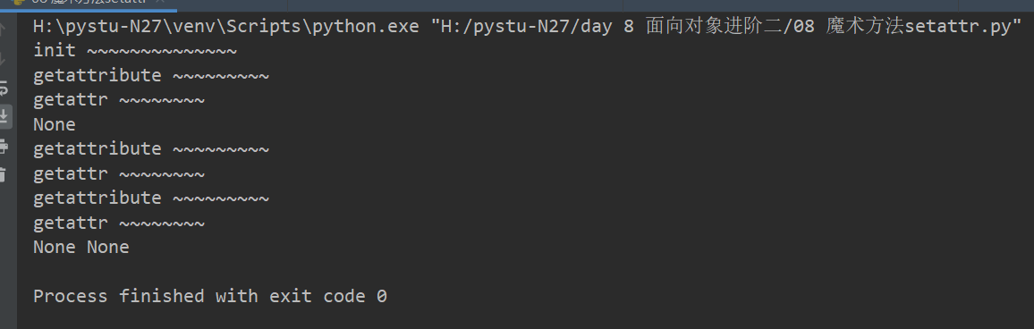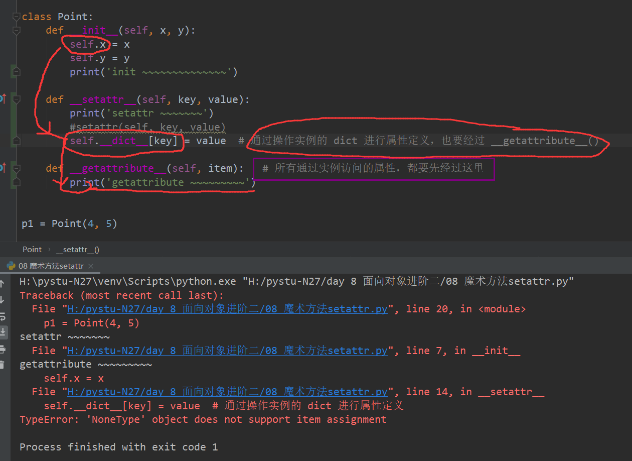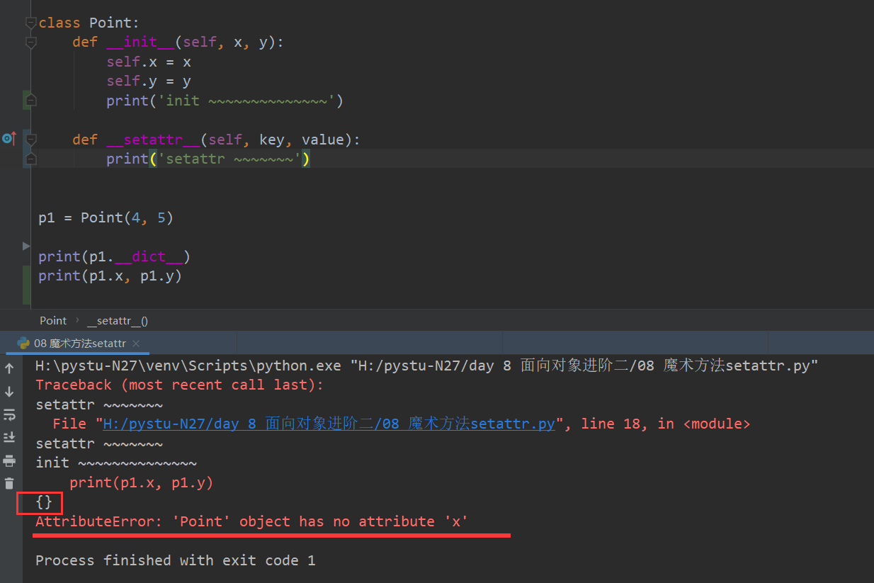 如果__setattr__() 中没有定义属性,__init__()中的属性是不生效的,dict字典也是空的。