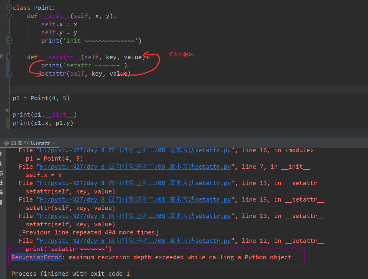 如果在__setattr__() 中,使用setattr() 定义属性,setattr() 会再去调用__setattr__() ,这样就会陷入一个死循环,为了避免这种死循环python定义了一个异常 RecursionError,递归到一定深度,就会抛出。避免了栈的崩溃。