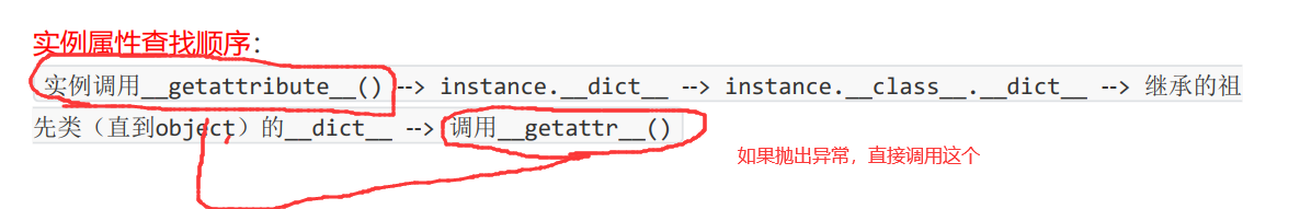 | instance.__dict__ --> instance.__class__.__dict__ --> 继承的祖先类(直到object)的__dict__ ---找不到--> 调用__getattr__() |