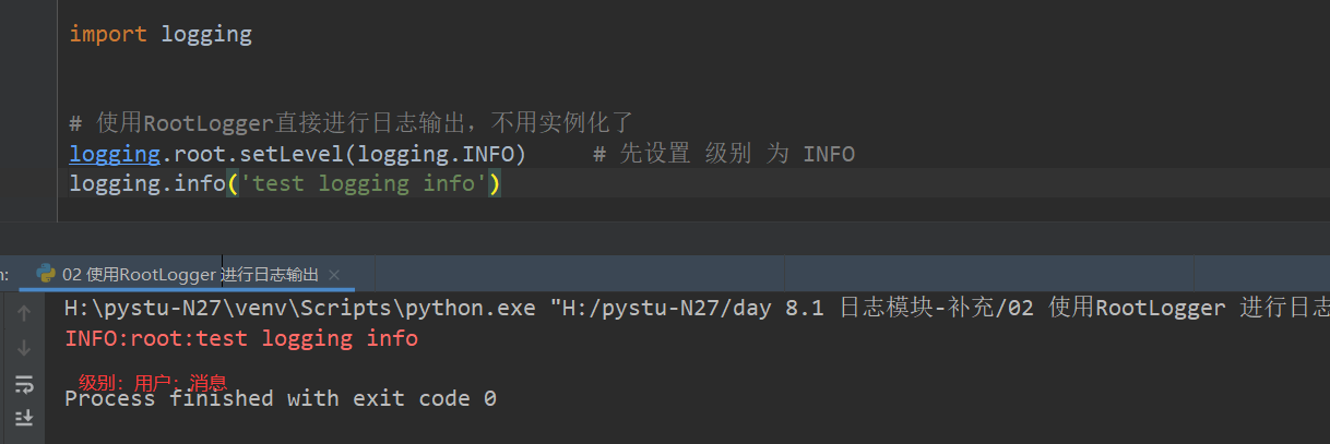 handle = logging.StreamHandler() # 定义一个Handle logging.root.addHandler(handle) # 添加到 logger handle.setLevel(logging.DEBUG) # 设置handler级别