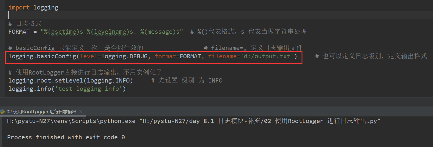 logging.basicConfig() 对记录器进行全局的配置。 注意:只能配置一次。