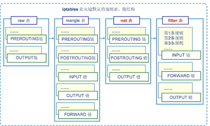 整个表、链结构可以理解为在内核运行空间的一块区域,划分为4个表,表内再划分为不同的链,链内为用户定义的规则。下图为表、链的结构图: