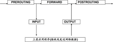 从图中可以看到,数据包从左边进入IP协议栈,进行IP校验以后,数据包被PREROUTING处理,然后就进入路由模块,由其决定该数据包是转发出去还是送给本机。若该数据包是送给本机的,则通过INPUT处理后传递给本机的上层协议;若该数据包应该被转发,则它将FORWARD处理,然后还要经POSTROUTING处理后才能传输到网络。本机进程产生的数据包要先经OUTPUT处理后,再进行路由选择处理,然后经过POSTROUTING处理后再发送到网络。